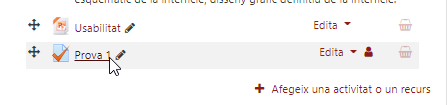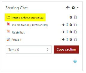 Quan tenim una aula amb el bloc Sharing Cart afegit, només es veurà amb l’edició de l’aula activa. Així mateix, al costat de cada recurs de l’aula apareix una icona (de cistell de la compra). Quan seleccionem aquesta icona, s’afegeix l’element corresponent al bloc de Sharing Cart.