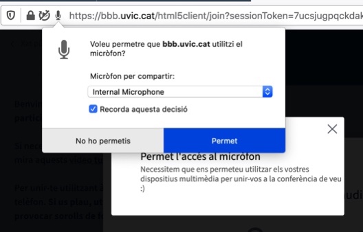 El primer cop que activis la càmera o el micròfon et demanarà permís específic. Assegura’t de marcar l’opció “Recorda aquesta decisió” per a properes sessions- Micròfon