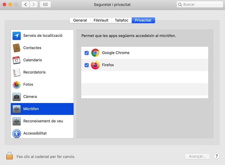 - Preferències del sistema > Seguretat i Privacitat > Micròfon