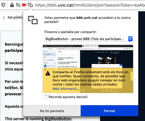 - Compartir pantalla: en aquest cas Firefox no permet recordar la decisió. Us ho demanarà cada vegada