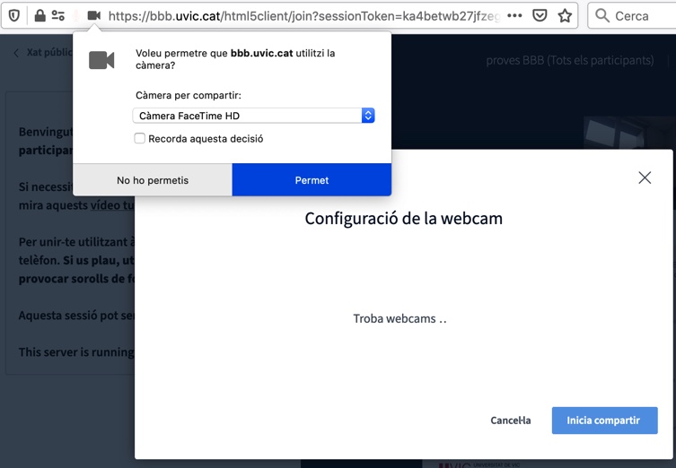 BigBlueButton és un sistema de vídeo conferència que s’executa directament al navegador sense necessitat d’instal·lar cap programari específic. Per aquesta raó cal assegurar que el navegador té els permisos adequats per funcionar correctament i poder accedir a la càmera i al micro, sobretot en dipositius MAC que necessiten, en algun casos, doble permís.