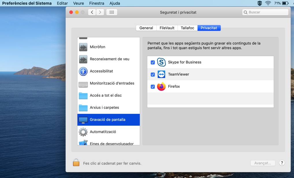- Preferències del sistema > Seguretat i Privacitat > Gravació de pantalla i assegurar-se que el navegador té el permís marcat