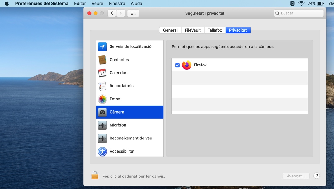 - Preferències del sistema > Seguretat i Privacitat > Càmera