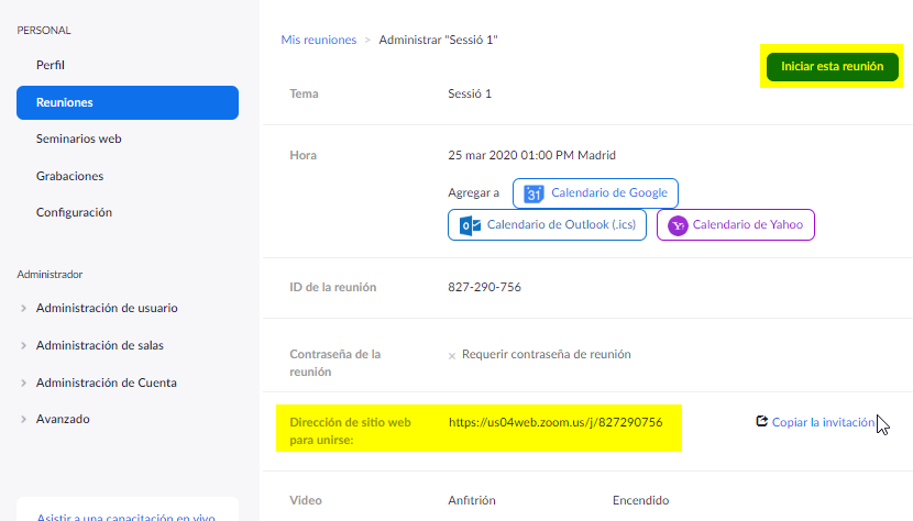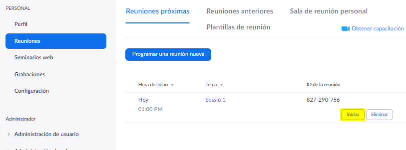 Si encara no és el moment d’iniciar la reunió, sempre trobarem totes les reunions dondes d’alta a l’apartat de “Reuniones”, i en qualsevol moment la podrem iniciar des d’allà.