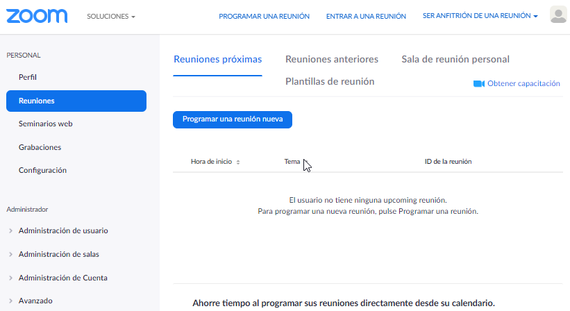 3. En el menú de l’esquerra seleccionarem “Reuniones” i després seleccionarem “Programar una reunion nueva“.