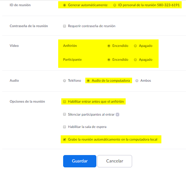 - ID reunió: podem d’utilitzar un de “personal”, que sempre serà el mateix o demanar que es generi un expecífic per a la reunió que estem preparant.