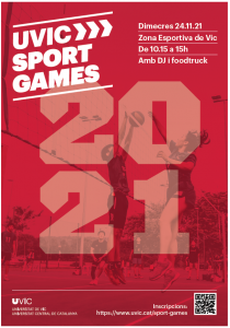 El 24 de novembre s’organitzen els UVic Sport Games, una jornada esportiva recreativa en la qual alumnes, professorat i PAS podran participar en competicions esportives, classes dirigides, activitats i molt més. Es tracta d’un festival esportiu organitzat per alumnat de CAFE amb la implicació dels graus en Nutrició Humana i Dietètica, Fisioteràpia, Grau en Multimedia, Aplicacions i Videojocs, Periodisme i Medicina, i comptarà amb l’animació d’un DJ, un foodtruck i actuacions sorpresa.