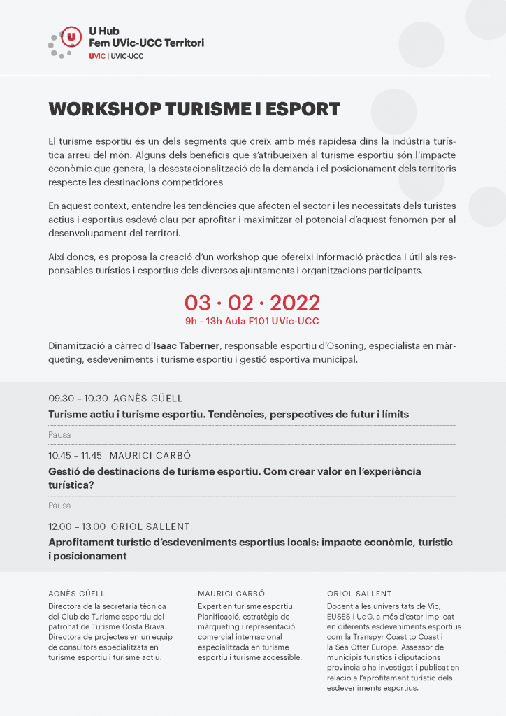 JORNADA TURISME I ESPORT Per més informació o inscriure’s, podeu trucar al 938815511 o bé escriure a: ogc@uvic.cat Comparteix: Feu clic per compartir al Facebook (S'obre en una nova finestra) Facebook Fes clic per compartir al Linkedin (S'obre en una nova finestra) LinkedIn Feu clic per compartir a X (S'obre en una nova finestra) X Feu clic per compartir al WhatsApp (S'obre en una nova finestra) WhatsApp By rosersilva|2022-01-24T14:50:20+02:0024 de gener de 2022|Cultura, Esports| Compartiu aquesta història. Trieu la vostra plataforma! FacebookXRedditLinkedInWhatsAppTumblrPinterestVkXingEmail: Llocs relacionats Els Col·loquis de Vic celebren la 30a edició sota el lema “El demà” 3 d'octubre de 2025 “Diàlegs”, una exposició d’Anna Pont a la Sala Gòtica de la UVic-UCC 3 d'octubre de 2025 L’Orquestra Inclusiva de la UVic i l’Orquestra Oberta de Centelles participen en el Festival Inspira de Ripoll 3 d'octubre de 2025
